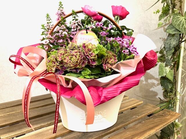 お母さまへの贈りものに、季節のお花をギュギュっと詰め合わせた