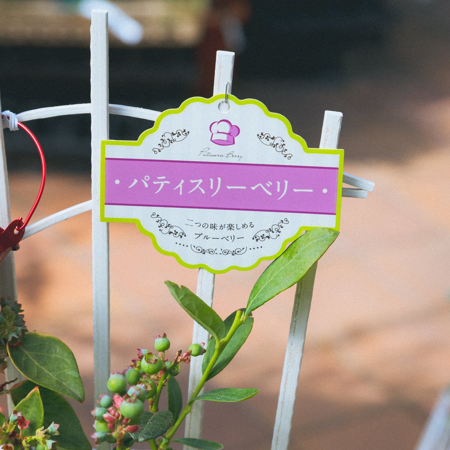 トレリス仕立てで、収穫用のブリキバケツと収穫後に使えるブルーベリーマフィンのレシピ付きです。