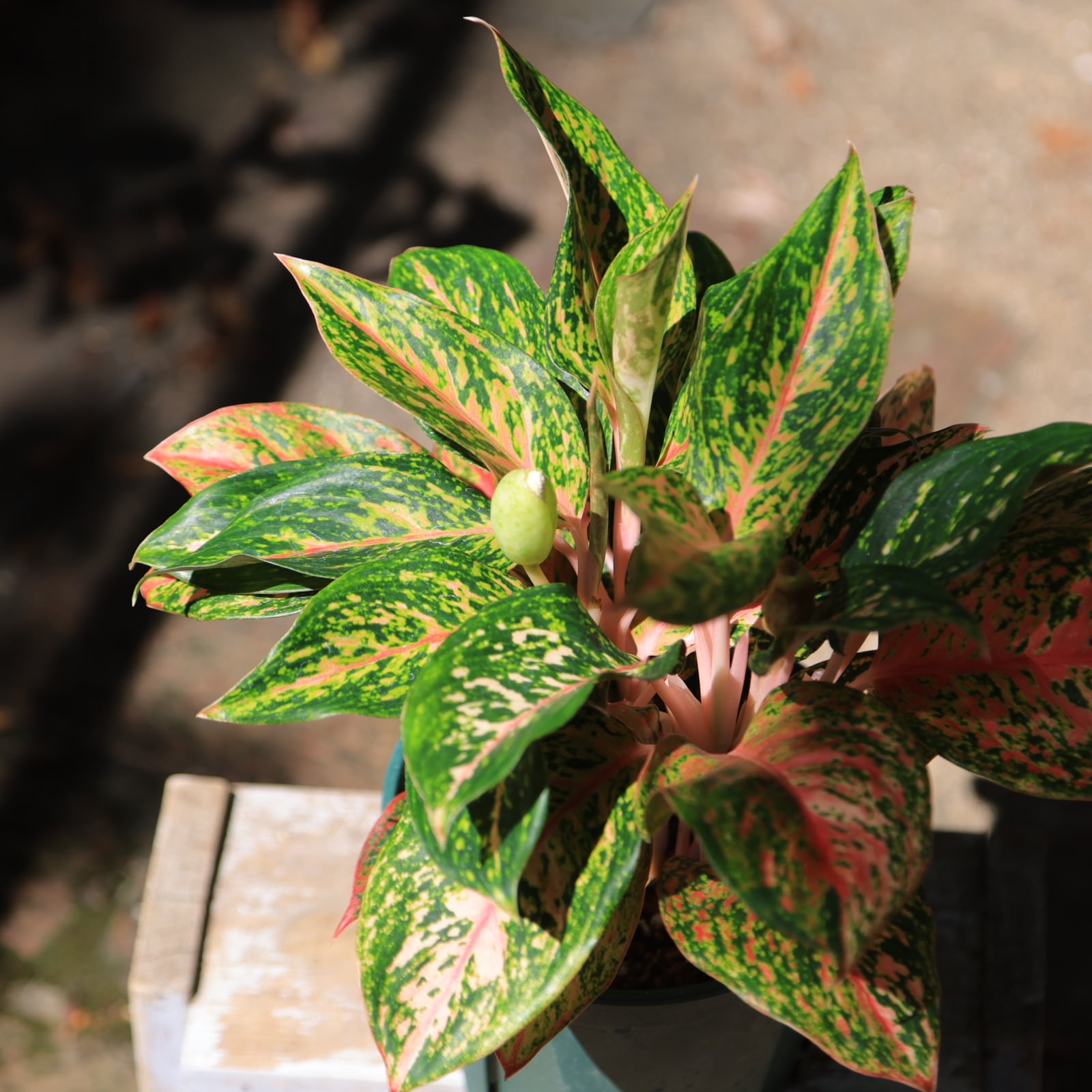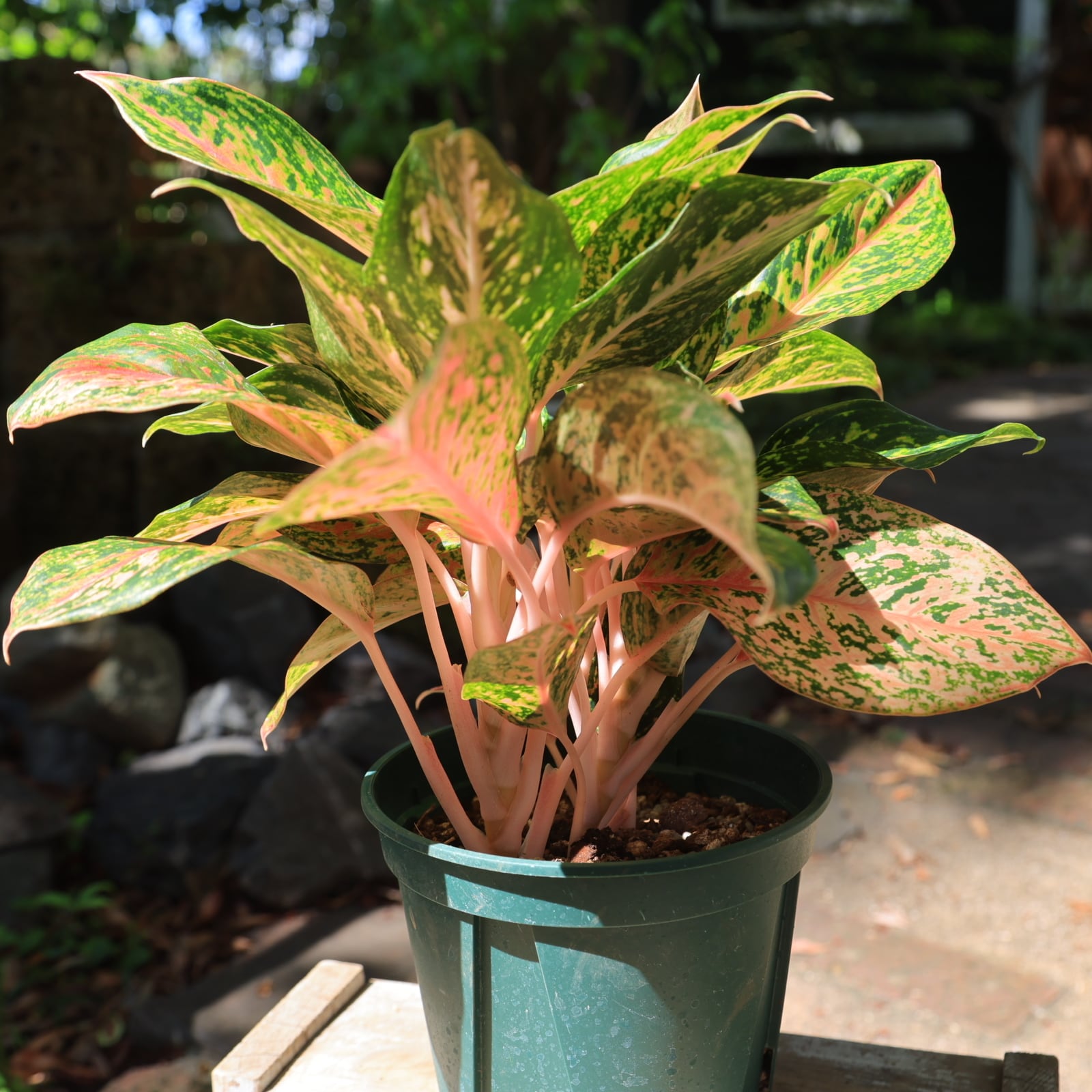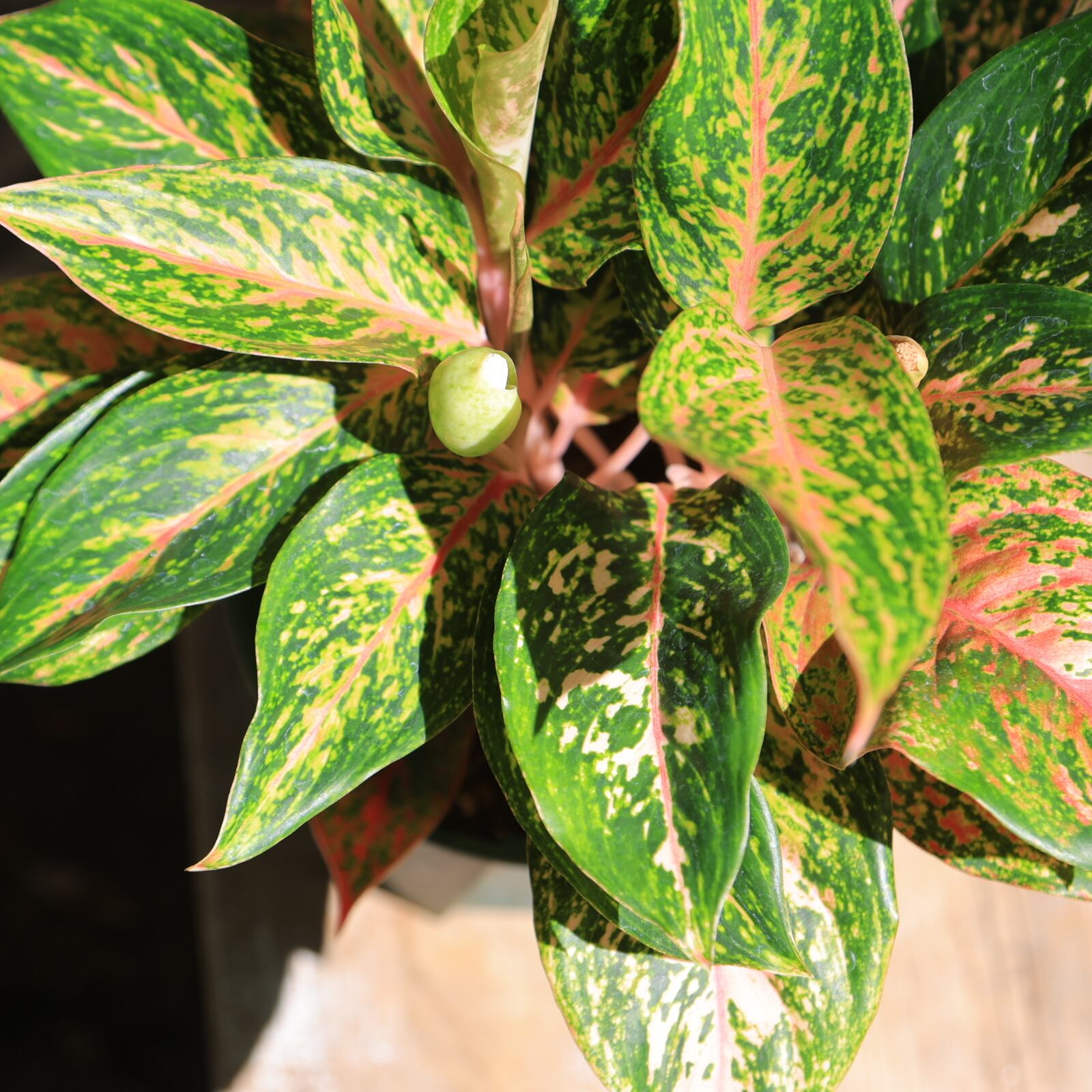 濃淡の緑と濃い赤のコントラストが美しいピンク系のアグラオネマです。